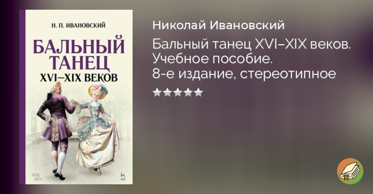 Книга «Бальный танец XVI – XIX веков» впервые увидела свет в 1948 году. Ее автор Николай Павлович Ивановский (1893–1961) – артист балета Мариинского театра, педагог историко-бытового танца в Ленинградском хореографическом училище, профессор Ленинградской консерватории. Являясь первым в своем роде учебным пособием для хореографических училищ, книга содержит подробные описания техники исполнения старинных танцев: паваны, алеманды, куранты, гальярды, ригодона, менуэта, контрданса, полонеза, мазурки, вальса и других.
