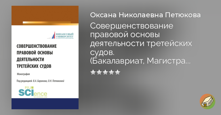 Совершенствование правовой основы деятельности третейских судов: монография Коллектив авторов Под ред. В.А. Баранова, О.Н. Петюковой. – Москва: Издательство «Русайнс», 2016. – 232 с. В монографии представлен сравнительный анализ российского законодательства, регулирующего деятельность третейских судов, правоприменительной практики, международно-правовых норм, а также нормативных правовых актов отдельных зарубежных государств, который позволил сформулировать основные направления совершенствования законодательства для повышения привлекательности и авторитета третейских судов, созданных на территории Российской Федерации. Издание адресовано научным работникам, преподавателям, аспирантам и студентам юридических вузов, практикующим юристам и всем, кто интересуется проблемами третейского разбирательства. Монография подготовлена по результатам научно-исследовательской работы по Госзаданию Финуниверситета на 2015 г.