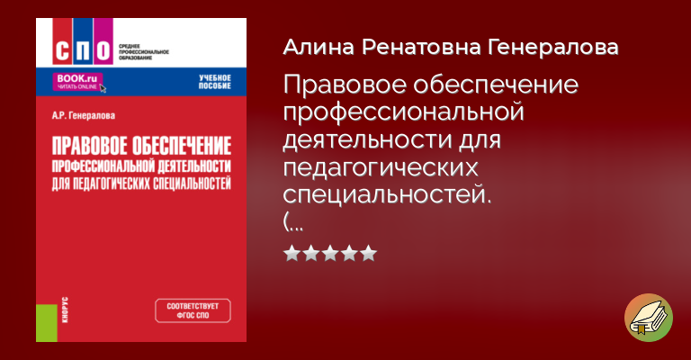 Содержит практические задания, некоторые из которых направлены на правовой анализ нормативных правовых актов, так или иначе связанных с педагогической деятельностью. Подобные задания способствуют повышению юридической грамотности. В Приложении содержатся образцы обращений, жалоб и заявлений в государственные органы, которые могут быть поданы в связи с нарушением тех или иных прав. Соответствует ФГОС СПО последнего поколения. Для студентов среднего профессионального образования, обучающихся по специальностям группы «Образование и педагогические науки».